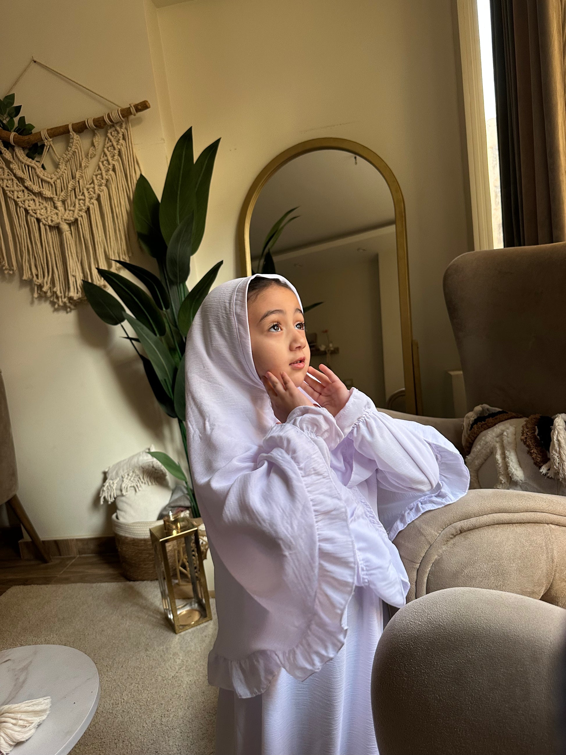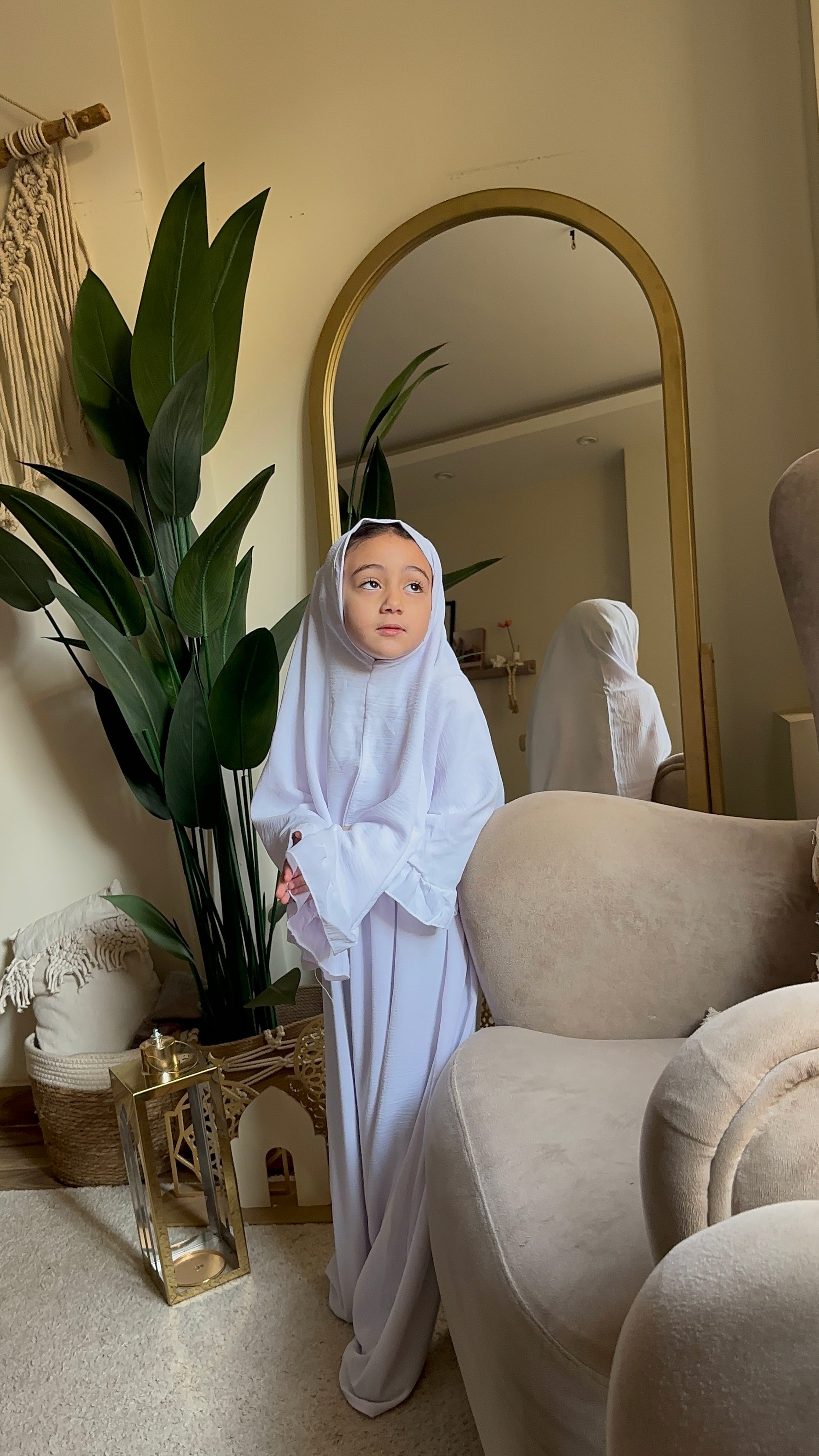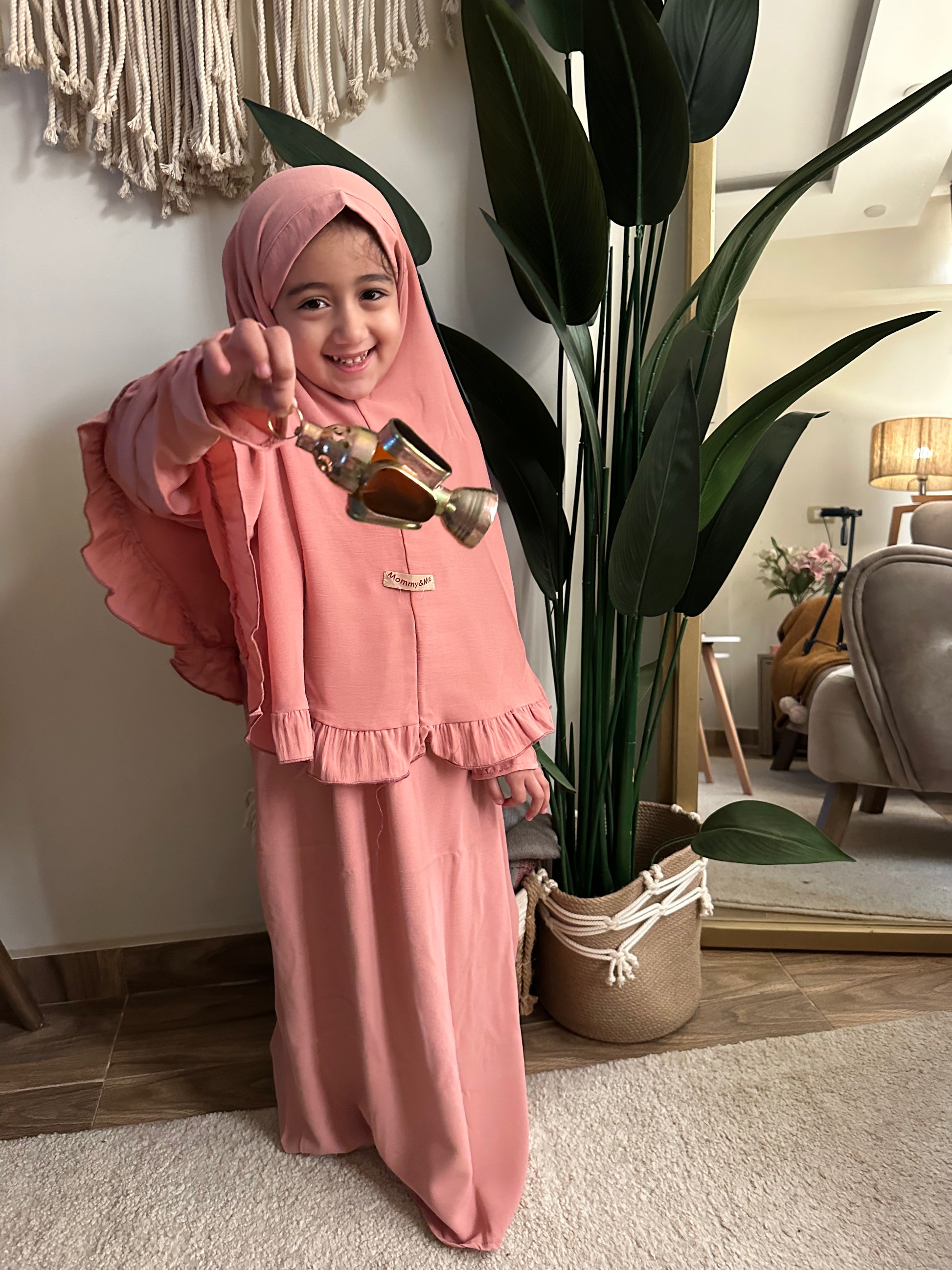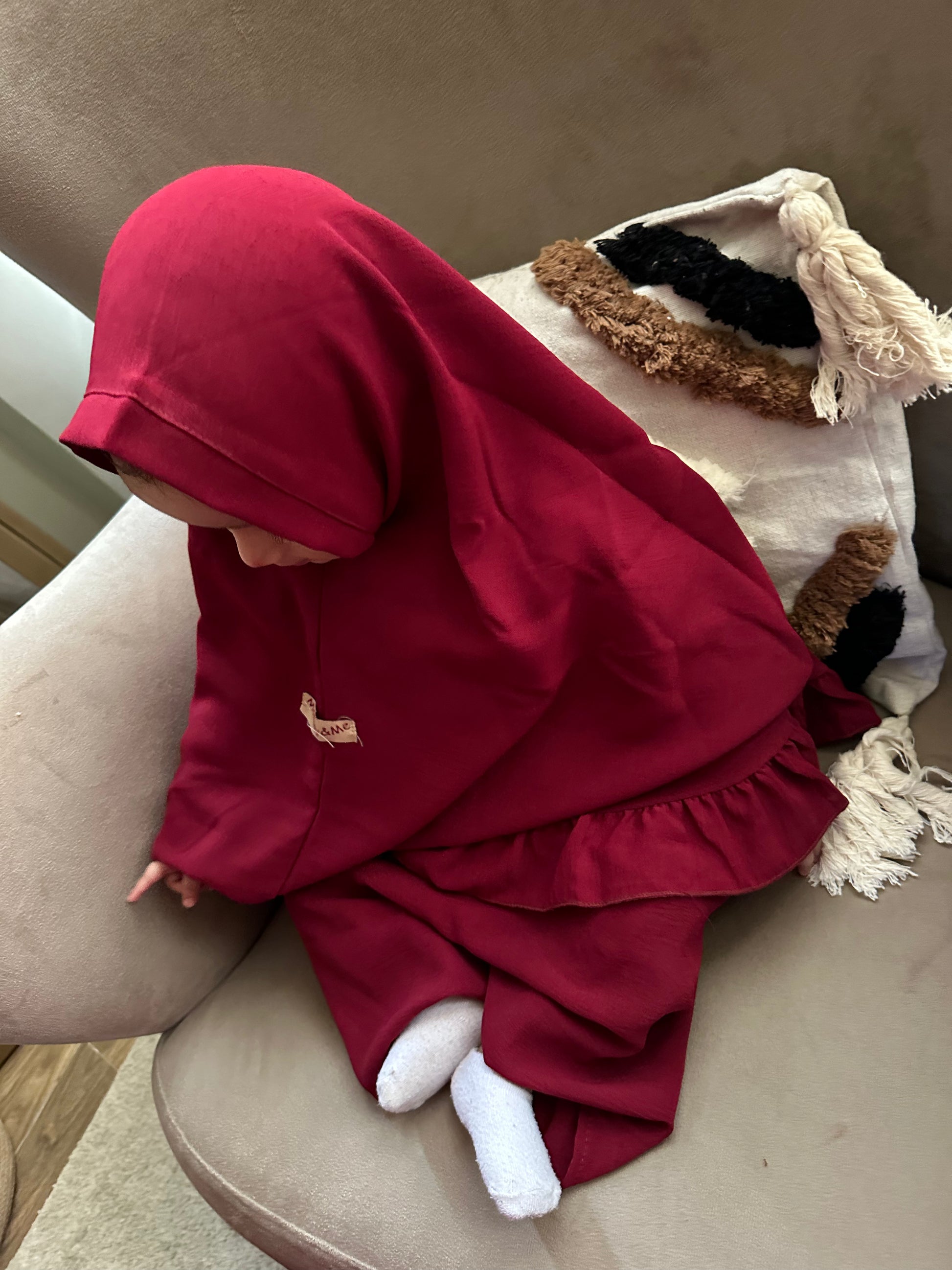 المميزات: خامة طرية جداً وباردة، ناعمة على بشرة الأطفال الحساسة، خفيفة ومش بتقيد حركتهم أثناء الصلاة أو اللعب.